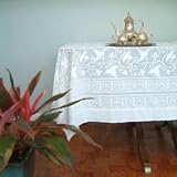 Product DescriptionUse our colorful cotton tablecloths to set the mood you want to create, regardless of the occasion. So whether you are looking for colorful picnic table cloths, or something cheery for your country kitchen or even a decorative atmospheric setting for an elegant formal dinner party; this luxury cotton tablecloth is sure to add vibrant color and drama to the banquet.The table cloth is 120 inches long and 70 inches wide. Each tablecloth is printed on preshrunk, superior grade, soft cotton and is exquisitely finished with neat double stitched hems.Each tablecloth is printed on preshrunk, superior grade, soft cotton and is exquisitely finished with neat double stitched hems.Each piece is handcrafted using intricately hand carved wooden blocks and is an original work of art distinguished by the work of the artisan, the particular lot of dye, and even varying weather conditions. Tonal variations are inherent to the block printing process and enhance the individuality, character and uniqueness of each creation.About this design: Ivy Lace: The pristine porcelain innocence of Ivy Lace contrasts beguilingly with the sensual ornamental eloquence of its scrolling vines. The Ivy Lace pattern has a romantic and nostalgic air about it; conjuring up images of high teas, polished silver, pearls, and elegant gowns.. Use Ivy Lace to create an atmosphere that captures the classic timeless elegance of a bygone era.