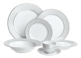 Gift-boxed and ready to get a marriage under sail for entertaining, this 42-piece set consists of eight place settings, each comprised of a dinner plate, salad plate, soup plate, teacup, and saucer. A serving bowl and platter round out the collection. While platinum-trimmed china is dishwasher-safe, most manufacturers recommend air-drying, as heat can soften the luxurious platinum bands. --Ann Bieri
